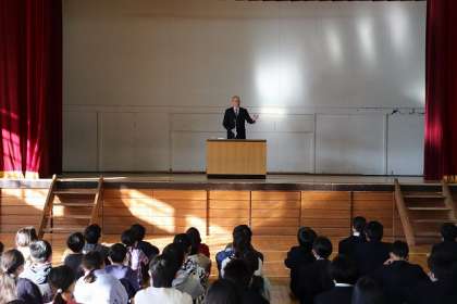 校長先生のお話「小学部の皆さんは『おひさま杯』(校内漢字テスト)に取り組みました。中学部は『入試』の時期となりがんばっています。学校では、学習だけではなく社会人として身に付けることも学んでいます。当番の仕事や係の仕事など。これからも日々成長していく自分をめざしてがんばっていきましょう。」