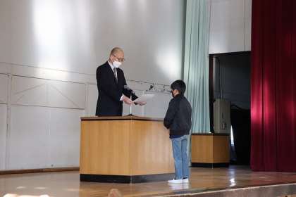 おひさま杯の表彰です。代表の子に賞状を授与しました。この後、担任の先生から「おひさま賞」「にこにこ賞」「がんばり賞」をいただきます。