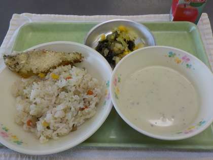 今日の献立:根菜ピラフ、白身魚のハーブ焼き、ジャガイモのポタージュ、わかめサラダ、りんごジュース