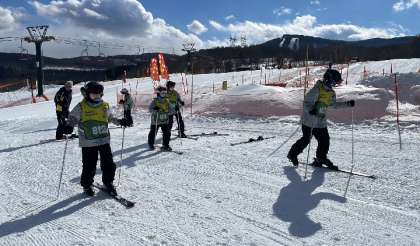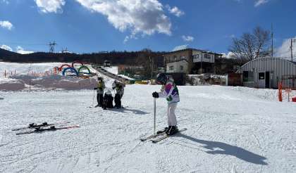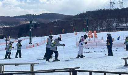初心者の皆さんはドキドキの瞬間。まず片方だけ板を履いて滑ってみます。
