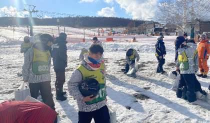 後に見えるリフトは日本1長くて乗っている時間はなんと20分。(なので日本1が2つあるスキー場だそうです)人によっては心細くなってきたり、ポカポカ陽気だとうとうとしたりするそうです。初心者の皆さん、明日は乗れるか?