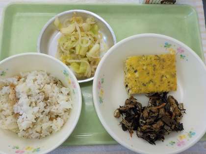 今日の献立:胡麻じゃこご飯、厚焼き卵、ひじきの炒め煮、野菜のおかか和え