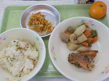 今日の献立:菜めし、赤魚の薬味焼き、筑前煮、人参しりしり、くだもの
