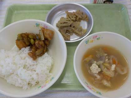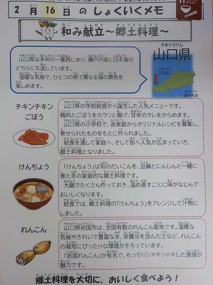 今日の献立【和み献立 山口県】:ごはん、チキンチキンごぼう、けんちょう汁、れんこんの炒め物