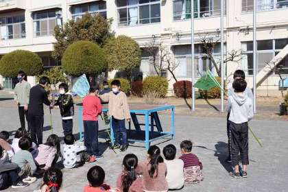 3学期のたてわりロング集会を行いました。校長先生のお話、旗の引き継ぎ式(6年生から5年生へ)です。