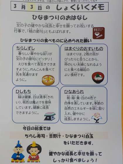今日の献立【ひなまつり献立】:ちらし寿司、吉野汁、ひなまつり白玉