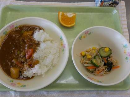 今日の献立:カレーライス、わかめとツナのサラダ、くだもの