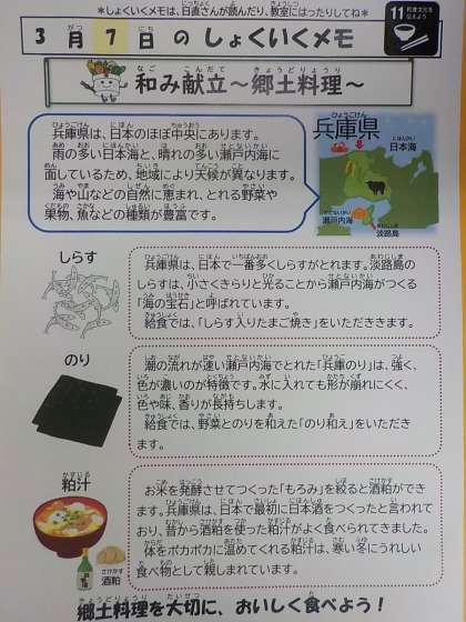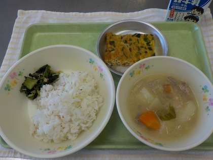 今日の献立【和み献立 兵庫県】:ごまごはん、シラス入り卵焼き、のり和え、粕汁