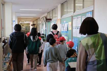 まごころ保育園の園児を案内しています。「ようこそ、館小学校へ」
