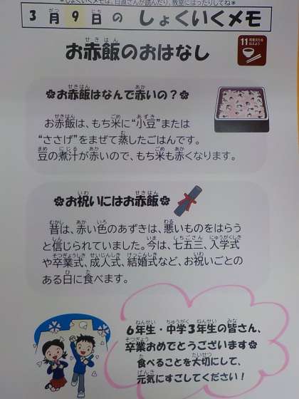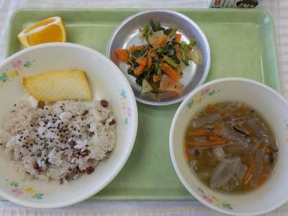 今日の献立【卒業お祝い献立】:赤飯、いかの黄味焼き、沢煮椀、野菜のおかか和え、くだもの