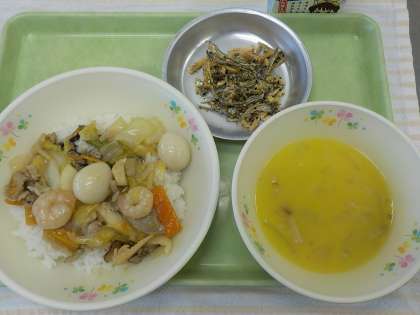 今日の献立:中華丼、コーンスープ、ナッツと煎り子の胡麻がラメ