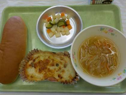 今日の献立:ミルクパン、マカロニグラタン、千切り野菜スープ、野菜のピクルス