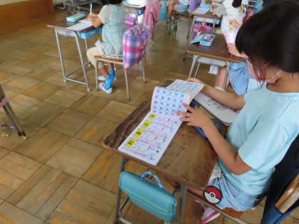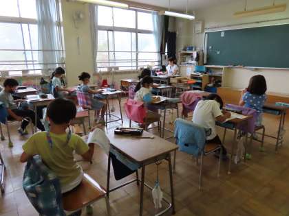 先生の言葉に、教室内のみんなが、漢字ドリルを真剣に確認しています。