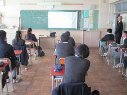 中学部1年生、体育。3年生、社会。の授業の様子です。1年生には学習サポーターが入っています。社会の授業では映像資料等を大切に授業を行っています。