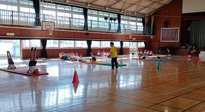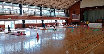 マット運動で体の柔軟性を高める運動に取り組んでいます(^^)
