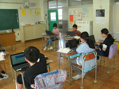 一人一台のchromebook、仲間同士で考えを共有する、教科書に加えてさらに詳しく調べるツールの一つとして、ノートへ記録するだけでなくパソコンで記録したりまとめたりする手段として、学習の理解の定着を図る手立ての一つとしてなど、どのような学習場面で活用するのが効果的かを教員同士で共有しながら、活用を進めています。(写真は5年生の社会・6年生の国語の様子です)