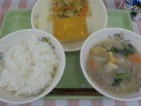 今日の献立※ 大豆ピラフ※ チキンのハーブ焼き※ オニオンスープ※ 果物※ 牛乳...