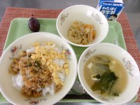 🍚9月22日のこんだて🍚・二色丼・豆腐とじゃがいものみそ汁・野菜のおかか和え・プ...