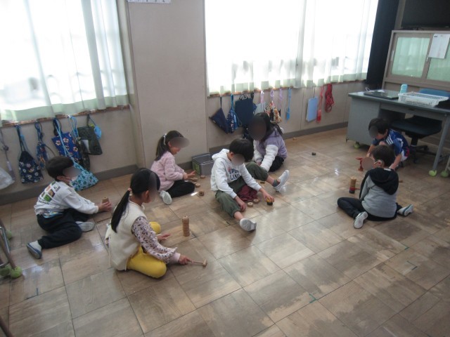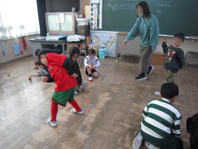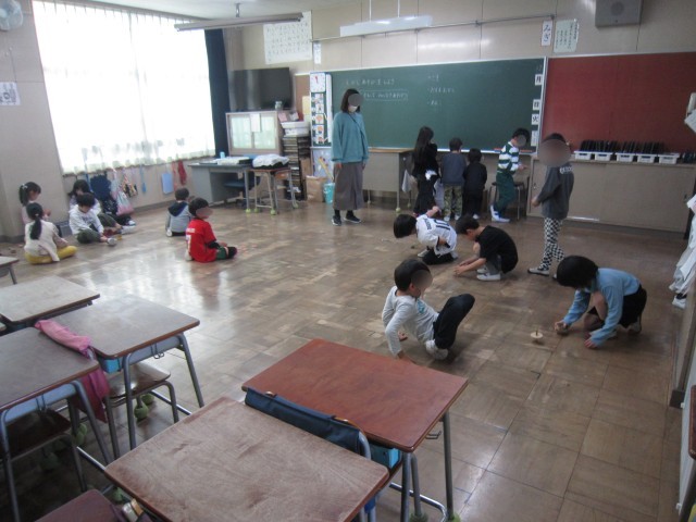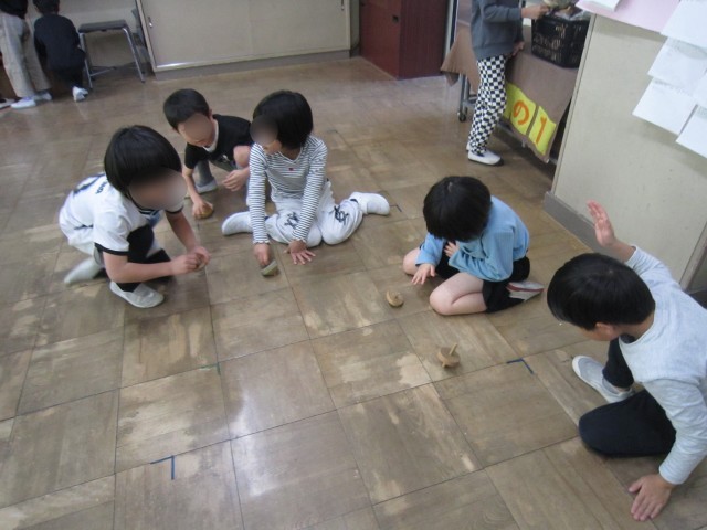 1年生が生活科で昔遊びを楽しみました。こま回しやめんこ、だるま落としなど、子どもたちは夢中になって挑戦していました。友達と教え合いながら、昔から伝わる遊びの面白さを感じる時間となりました。