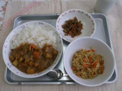 今日の給食は「たけのこ学級」のみなさんのリクエスト献立のカレーライス、福神漬け、ボイル野菜のごまドレッシング、牛乳です。今日はじゃがいものかわりに「さつまいも」を使用しました。カレーに入ってしまうと、さつまいもの色が目立ちませんが、食べるとほのかに甘さを感じます。たけのこ学級のみなさんもカレーの中のさつまいもを食べて「甘い!」「おいしい!」と言ってくれました。