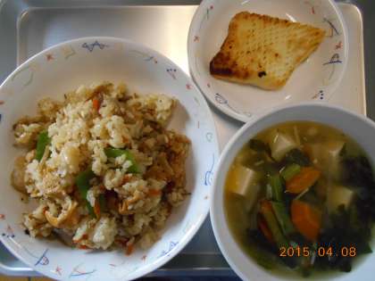 鶏牛蒡ご飯・いかの香味焼き・小松菜汁・牛乳