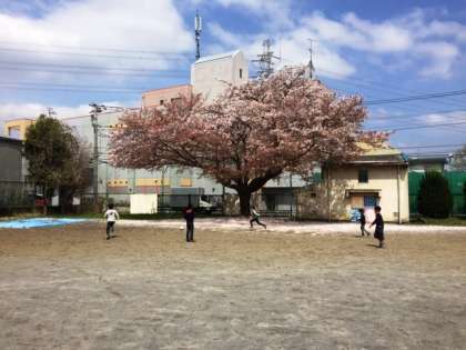 休み時間の風景です。桜の木をバックに、子供たちが元気に遊んでいます。それでも、100人いるかどうか・・・です。得意なことや好きなこと、休み時間にやりたいこと、それぞれあるとは思いますが、天気が悪くない限り、できるだけ外で遊んでほしい。そう思っています。外で、新鮮な空気を吸いながら過ごすだけでも、良いリフレッシュになりますよ!