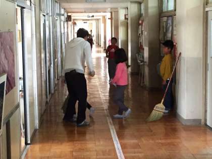 昼休み時間の後は、掃除の時間になっています。職員室〜校長室にかけての廊下は、3年生が担当になっています。今日は、担任の先生と掃除の進め方について教えてもらい、しっかりと確認していました。