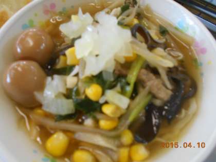 今日は、八王子ラーメンです。おなじみの刻み玉ねぎと、うずらの