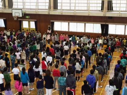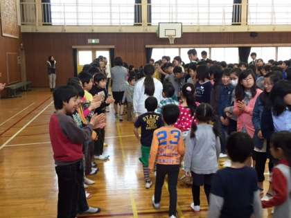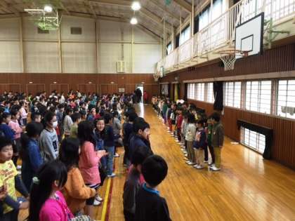 最後は、全員で「さんぽ」を元気に合唱しました。退場は、各学年の列の間に通路を作り、ジグザグに歩いて退場しました。