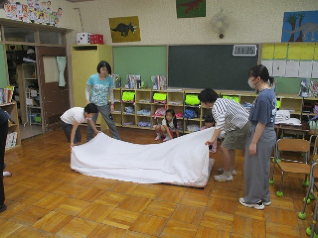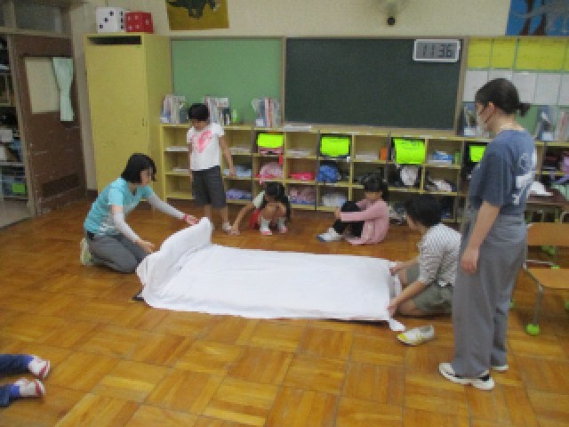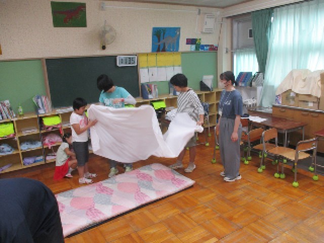 布団は2人一組になり、実際に一緒にシーツをかけたりするなど協力して敷き方、たたみ方の練習をしました。