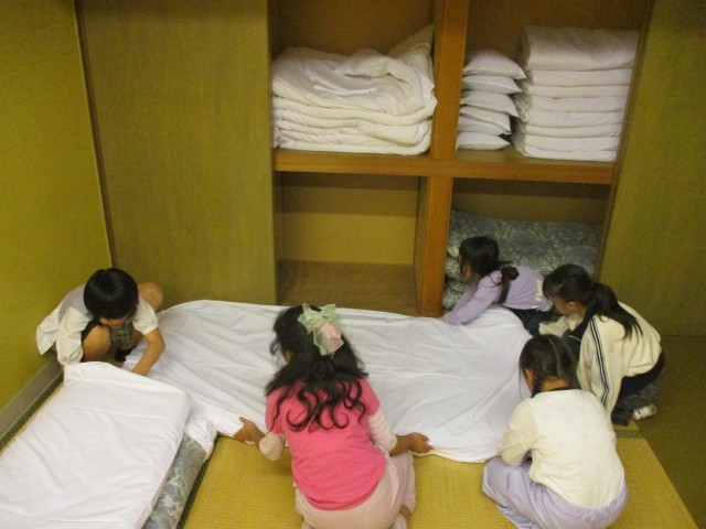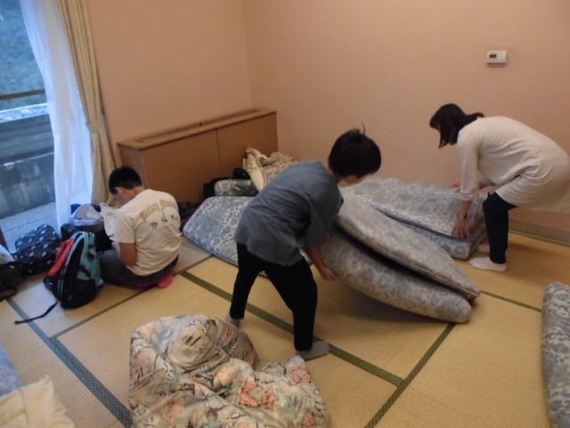 部屋に入ると1日目の振り返りを書き、自分たちで協力して布団を敷きました。大きなシーツも二人で協力することで、きれいにかけることができていました。