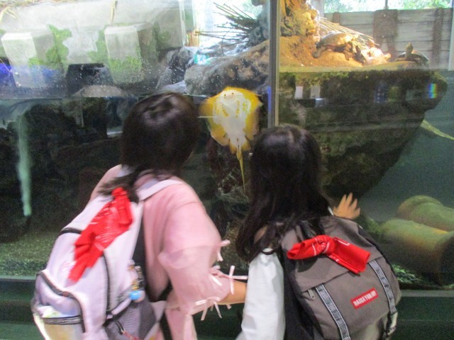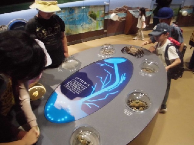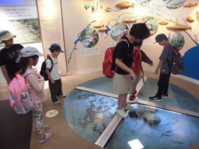 ふれあい科学館では、相模川に住む生き物たちを、水槽のそばでじっくり観察し、コイやウグイといった魚たちに餌やり体験も行いました。ピチピチとたくさんの魚たちが群がってくる様子に、始めはおそるおそるといった様子でしたが、次第に大胆に餌をあげられるようになり、指に吸い付こうとする魚にも物怖じせず、触れ合えるようになった子ども達もいました。