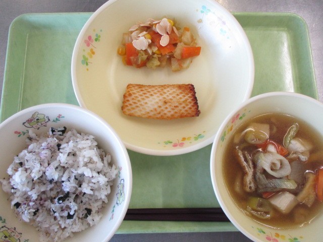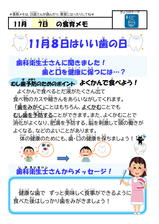 ★今日の給食は、11月8日の「いい歯の日」にちなんで、噛み応えのある食材やカルシウムが多く含まれている食材をたっぷり入れて作りました。