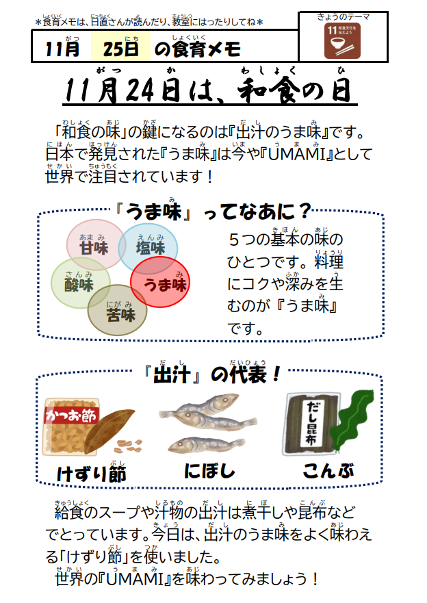 ★今日は、11月24日の和食の日にちなんで、だしのうま味を味わえる給食を出しました。