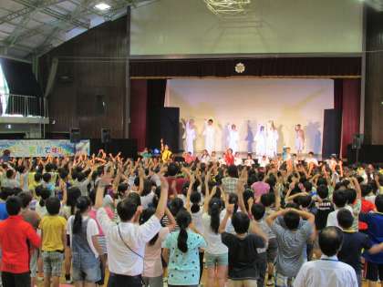 ユーモアもちりばめながらストーリーは展開し、最後には出演者と全校児童が一体となってミュージカルを盛り上げました。