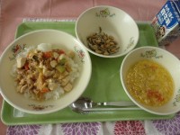 献立名四川豆腐丼小魚と豆のごまがらめコーンとたまごの中華スープ牛乳豆腐は体をつく...