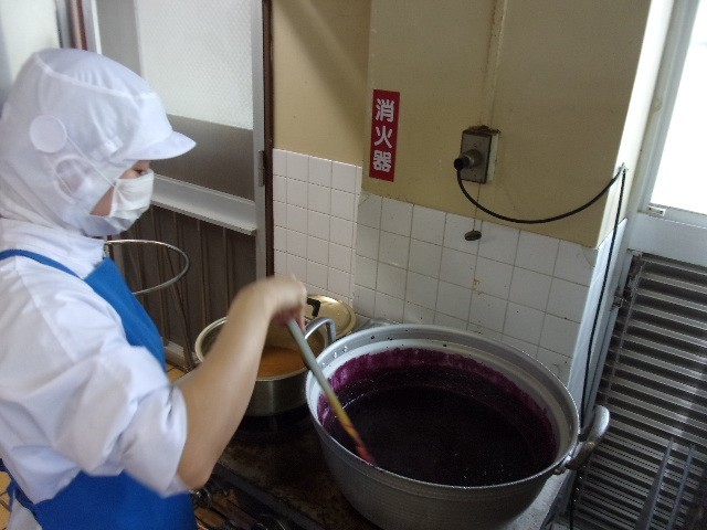 給食室では、砂糖やレモン汁と合わせて、しっかり煮込んで、でも少しだけ実が残る味わい深いソースにします。