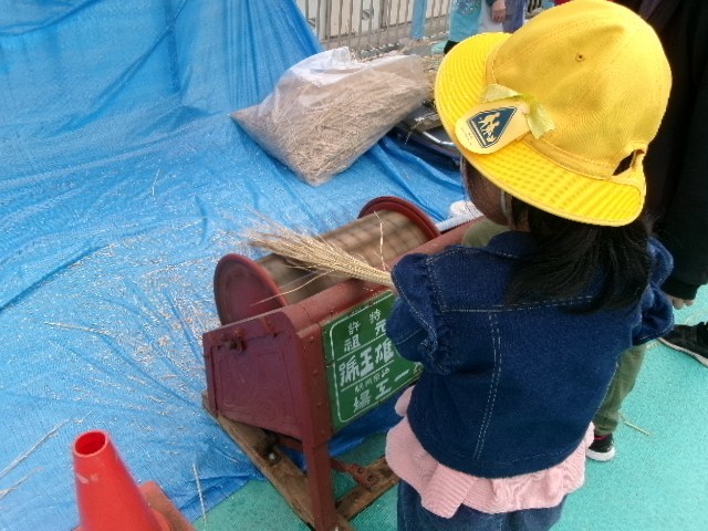すぎの子学級の子供たちが、育てた稲の脱穀をしていました。