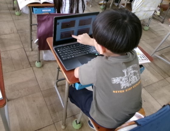 1年生が生活科(秋のおもちゃを作って遊ぼう)の学習で、教科書に載っている2次元コードを読み取り、何を作ろうか考えていました。
