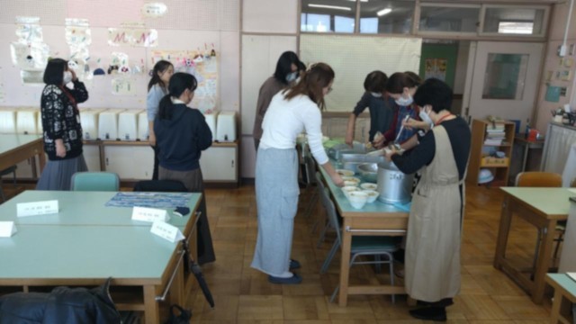 参加者の皆さんは、本校栄養士からの説明やアピールを聞いた後、子どもたちの給食準備の様子を参観しました。