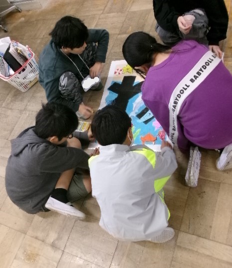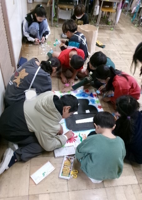 たてわり班で「うつきだいオーシャン」をイメージして、一文字ずつ個性あふれる作品をつくり上げました。