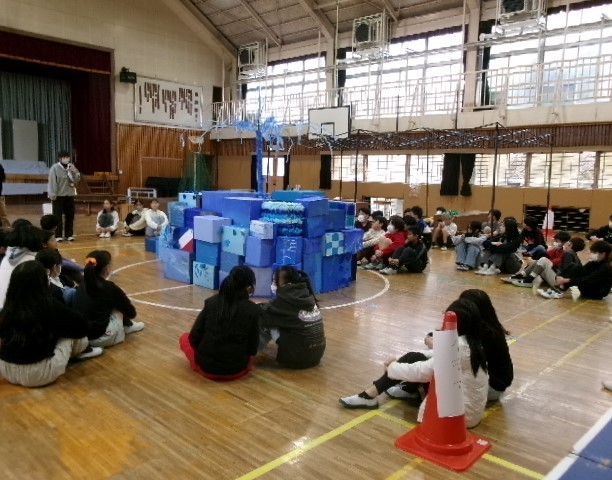 すぎの子学級は廊下を使って、6年生は体育館で作品作りをしていました。