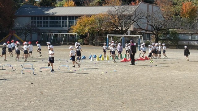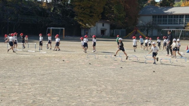 跳の運動遊びに取り組んでいます。コーンやミニハードルなどいろいろな障害物が置かれたコースを、元気に走り抜けています。