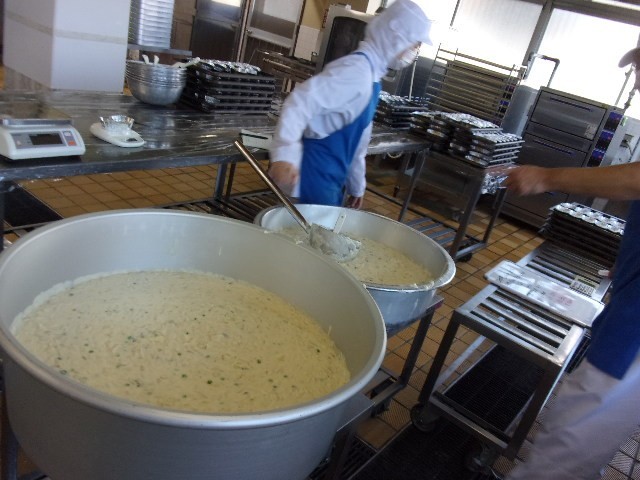 給食室では、ホワイトルウを手作りしてグラタンにします。