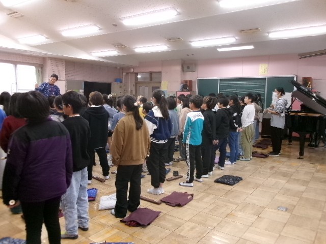 3年生と4年生は、金曜日の音楽発表会に向けて、はじめての学年合同練習をしていました。