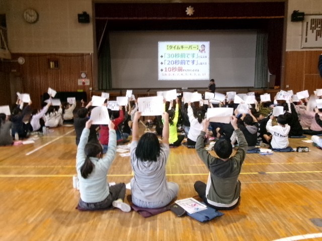 6時間目は、アナウンサー、ディレクター、タイムキーパーの体験学習をしました。