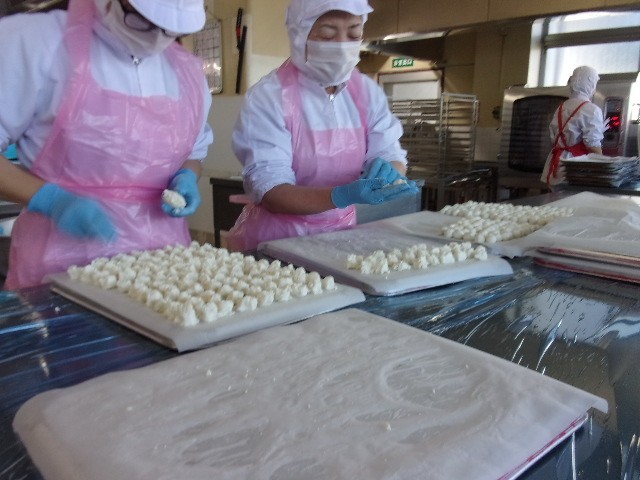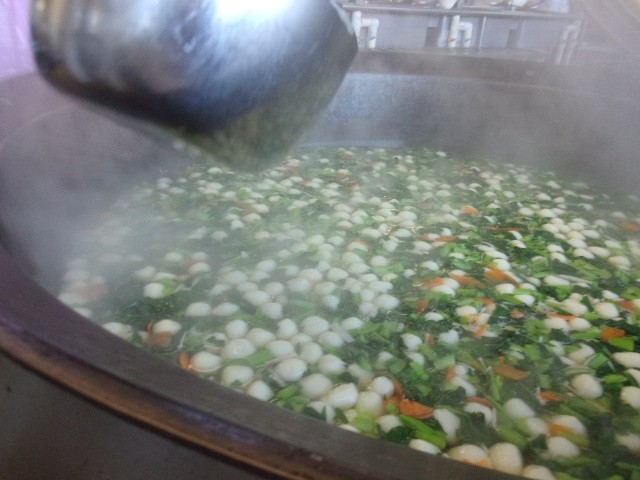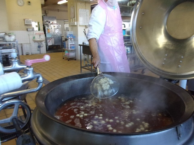 今日の給食では、 白玉のすまし汁 を食べます。調理員さんが、ひとつひとつ丁寧に丸めました。