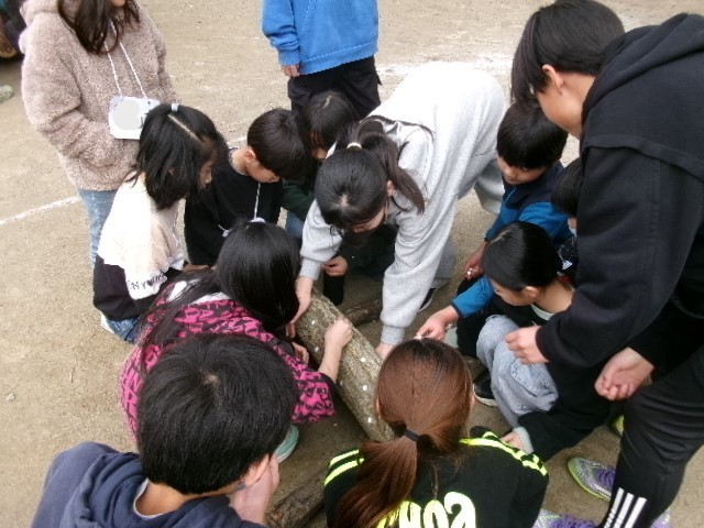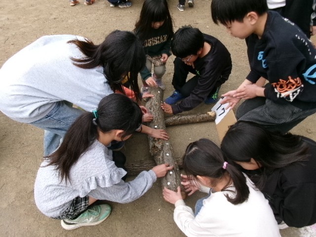 今日は、たてわり班グループの13班から24班が、椎茸の菌を木に入れる活動をしました。