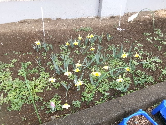「育ての会」が植えてくださった水仙が咲き誇り、1年生が植えたチューリップも咲き始めました。