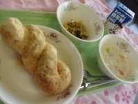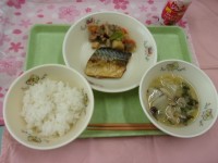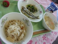 『今日のお米は今年の夏から秋にかけて刈り取った採れたてのお米です。新米が食べられるのは12月いっぱいまでなので、季節限定のおいしいお米です。5年生も昨日陸稲を収穫していましたね。食べるのが楽しみですね☆おうちでも新米を食べているのではないでしょうか?給食で使っているお米は岩手県産の「ひとめぼれ」です。今が旬のお米はおいしい上に栄養満点です。たっぷり食べて風邪を引きにくい体をつくりましょう!』